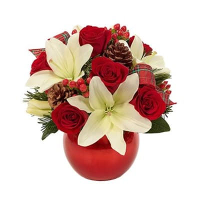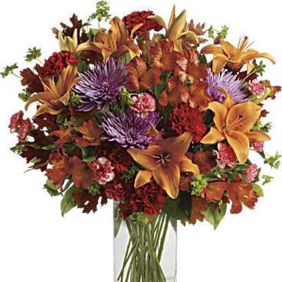 Price: $84.99 Orange roses.candel.yellow and red flowers ,red or yellow Lily's.fall leaf and greens. Product Tags: Next-day Delivery